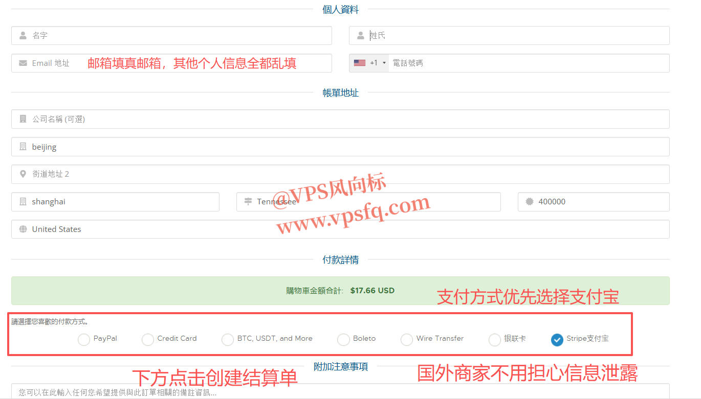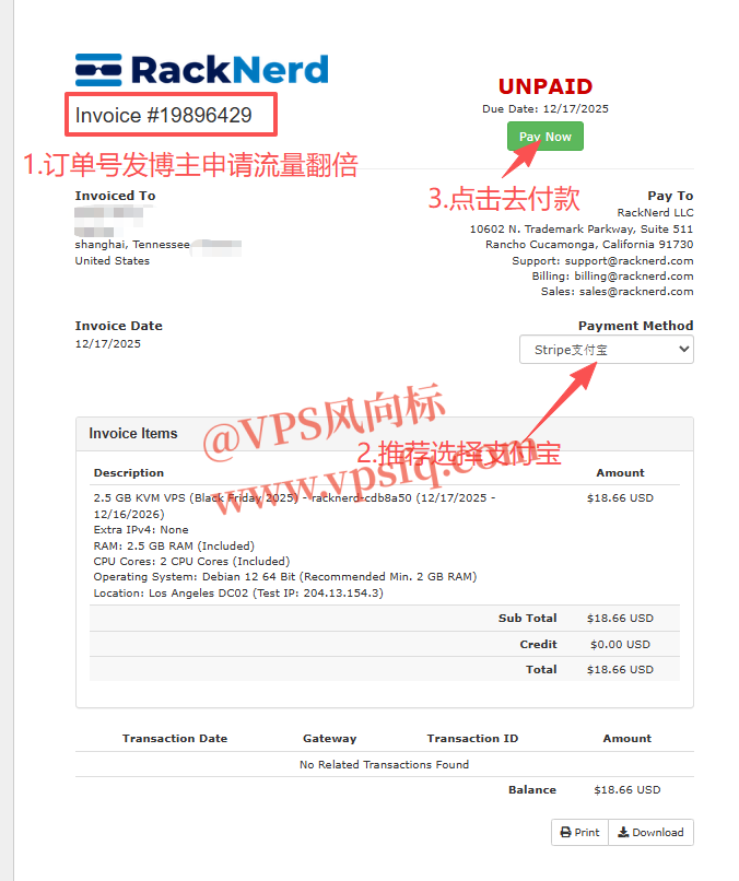 4、在账单页面,记住账单号,付完款后发博主邮箱 vpsfq01@gmail.com 可以申请免费翻倍流量,支付方式推荐选择支付宝,如果paypal可能会验证身份,再点击右侧**“立即付款”**
