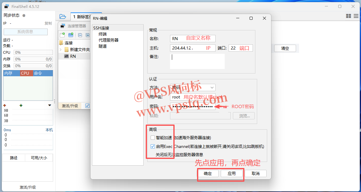 2、打开SSH远程管理软件,将以上SSH登录信息分别填入,这样就能远程连接并管理VPS了