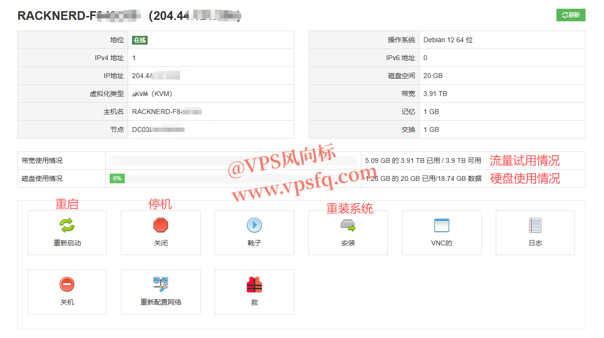 3、进入面板管理界面,可以看到系统配置信息、流量使用情况、硬盘使用情况,包括重启、停机、安装等按钮。