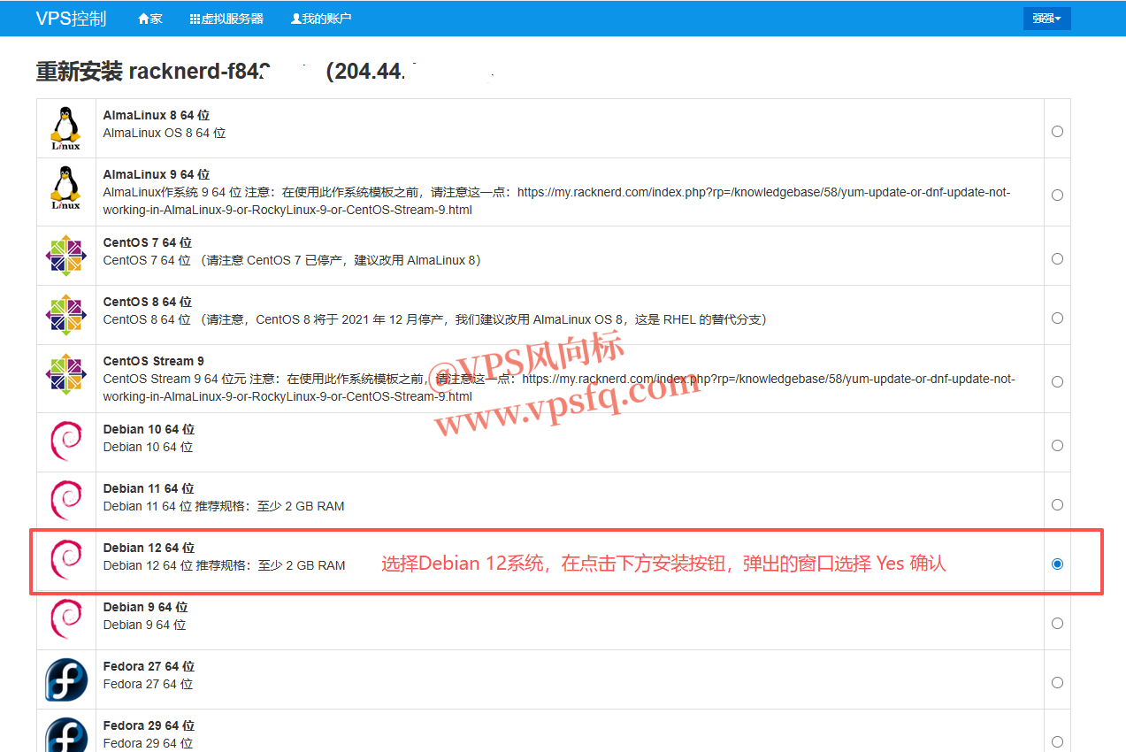 4、点击**“安装”按钮,我们选择Debian 12系统,实测1G内存也能运行,这是装机量最大的系统,各种教程、软件更多,所以推荐。然后点击下方红色“安装”按钮,进行安装。点击后会弹出确认窗口,点击“Yes”确认,然后最上方会弹出绿色的新ROOT密码**,保存并替换掉SSH远程工具的密码,注意最后可能有空格,要删掉。稍等两三分钟后就重装完毕,可以连接了,不会有邮件。