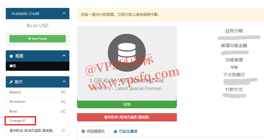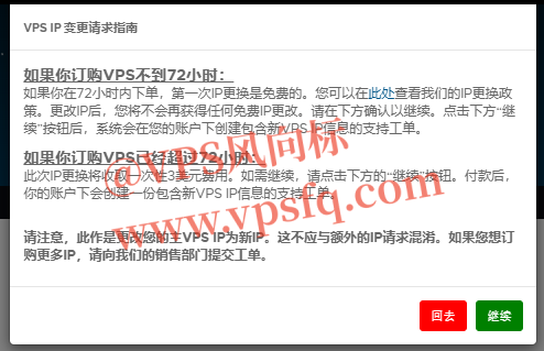 费换,我们打开 RackNerd客户中心 ,点击服务器的 IP,进入到下方的界面,点击 Change IP更换IP按钮,会弹出确认框,如果是购买三天之内换IP是免费的,后面按照提示操作换IP就行了。如果客服询问或者不给换,可以把IP测试截图附上。