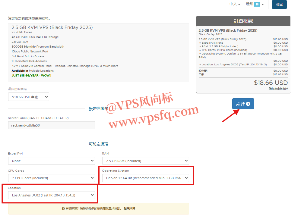 1、点击上方购买链接后,进入套餐配置页面,确认套餐配置信息,操作系统选择Debian 12,机房选择美国洛杉矶DC02或圣何塞San Jose,CA,再点击右侧**“继续”**。这个系统使用量大、教程多。