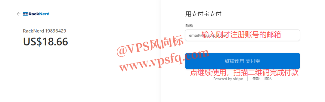 5、在支付页面,输入刚才注册的邮箱,并点击继续使用支付宝按钮,支付宝扫描二维码,即可完成支付。
