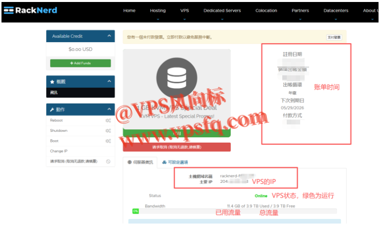 6、购买完成后,打开 RackNerd客户中心 就能看到自己的IP、流量等信息,包括后面翻倍信息也是在这里查看。