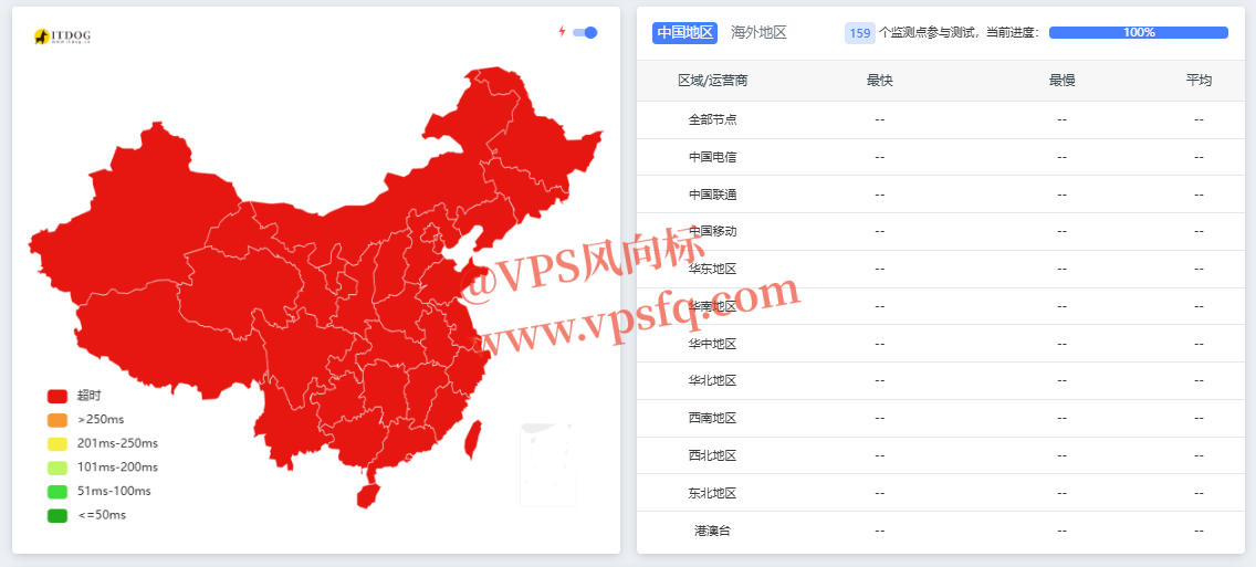 检查办法:我们打开站长工具 itdog.cn ,在输入框输入IP,并点击单次测试,我们观察测试结果。正常情况下中国大陆大部分地区都会是绿色连通状态,如果出现如下图大陆全为红色,即IP有问题。
