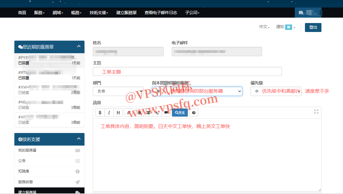 3、售后服务:支持中文工单,工单回复极快(半小时内)